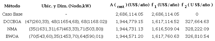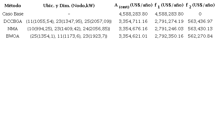 En la tabla 3 se observan en detalle los resultados numéricos obtenidos para el sistema IEEE 85-nodos en el escenario base y en el escenario con generadores distribuidos. En cuanto a la ubicación de los generadores distribuidos fotovoltaicos, estos se encuentran en los nodos 70, 35 y 64 y respecto al dimensionamiento de los generadores en kW es, 543.60, 1453.70 y 590.01 respectivamente. De igual manera es posible apreciar que, al igual que en el sistema de prueba anterior, el BWOA obtiene mejores resultados que el DCCBGA y el NMA. El caso base de referencia tiene un valor de costos de 2'686.114,05 US$/año, al compararlo con el mejor valor obtenido por medio del DCBWOA, i.e., 1'944.571,20 US$/año, se puede apreciar una reducción de costos de alrededor de 27,61%, lo cual indica una mejoría significativa. En cuanto al DCCBGA, se aprecia una reducción de 207.95 US$ respecto a los resultados obtenidos con BWOA, mientras que la diferencia en dólares del NMA respecto al BWOA es una considerable cifra de 159.93 US$, un importante ahorro en costos anuales de operación y mantenimiento.
