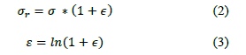 The values of real stress Or and real strain £ were calculated from the data of stress o and engineering strain e, obtained in the tensile test as shown in Equation (2) and Equation (3):