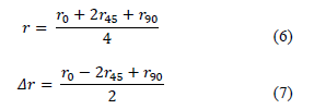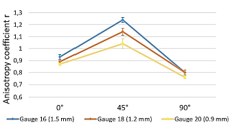 The results of the 5 samples were averaged and the values of r in each direction were obtained: r0, r45y r90, for each thickness.