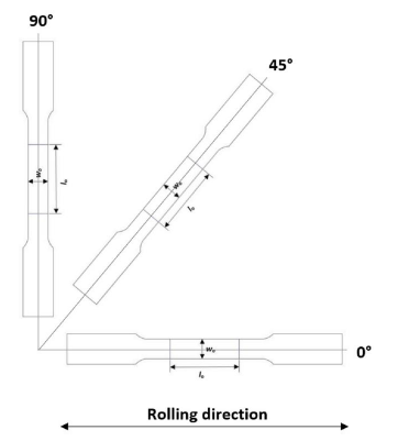 Contrary to what was observed in the metallographic study, a slight anisotropic behavior was presented in the measured mechanical properties, except for the elastic limit. The tensile strength and the hardening coefficient are higher in the samples with an orientation of 0° (in the rolling direction). At the same time, the elongation is lower than in the other two orientations.