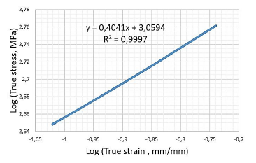 The logarithmic representation of the results of the true stress vs. the true strain allows for determining the value of the strain hardening exponent (n) using the empirical mathematical Equation (1), which applies to metallic materials [14].