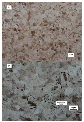 Figure 4 shows the microphotograph of the 18-gauge sample. In general, there are no significant differences between the microstructures of the three-gauge samples, and it comprises nearly equiaxed polygonal grains with annealing twins. The grain size of the austenite is between 10 and 25 μm. Since no alignment of the grains is observed in the direction of the last rolling, it is considered that the sheets were subjected to an adequate annealing process. Therefore, a marked anisotropic behavior is not expected.