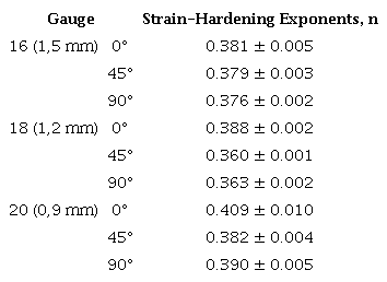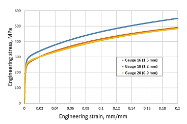 Figure 5 shows a comparison of the engineering curves of the 16-, 18-, and 20- gauge sheets for the 0° orientation. 16-gauge sheets have higher strength, while 18- and 20-gauge sheets do not differ significantly from each other. This behavior is observed in all three orientations. As mentioned above, in all cases the elastic deformation is considerably less than 10% of the real total deformation, therefore, method B of the ASTM E 646 standard was applied.