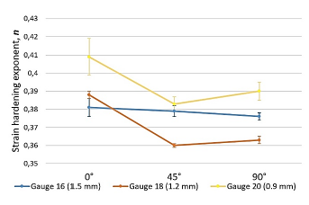 The results obtained from the strain hardening exponent (n) for the steels studied according to their thickness and their orientation are shown in Table 4. Again, a behavior similar to that of the elongation is observed, in which the value in the direction of the last lamination is different, in this case, higher than those of the other orientations, indicating a slight anisotropic behavior, especially in the 18- and 20- gauge sheets, as can be seen in Figure 6.