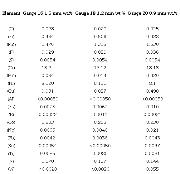 The elemental chemical analysis presented in Table 1 confirms that the material studied is 304 Steel, which can be classified as 304L grade, due to its low carbon content, 0.028%, 0.020%, and 0.025%. This grade of steel is often preferred in applications where welding is required as it eliminates the formation of chromium carbides during cooling in the heat-affected zone, HAZ [17].