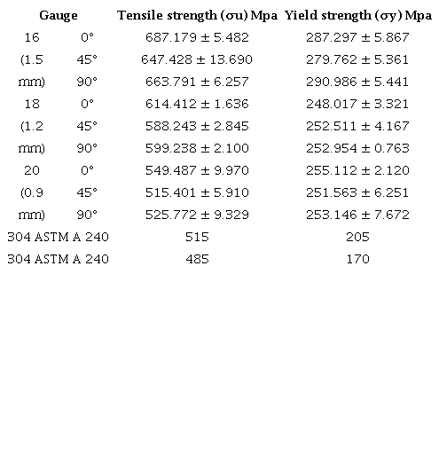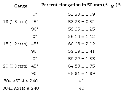 The values of elongation at break in 50mm of calibrated length (A50) obtained in the tensile test for each sheet thickness according to orientation are shown in Table 3. The mean values for the 16-, 18- and 20-gauge sheets are 57.38, 58.45, and 63.32% respectively. These values are very similar to the 57% reported by [20] for an AISI 304 steel with a thickness of 0.7 mm, and the 64% reported by [21] for an AISI 304L steel with a thickness of 1.168 mm.