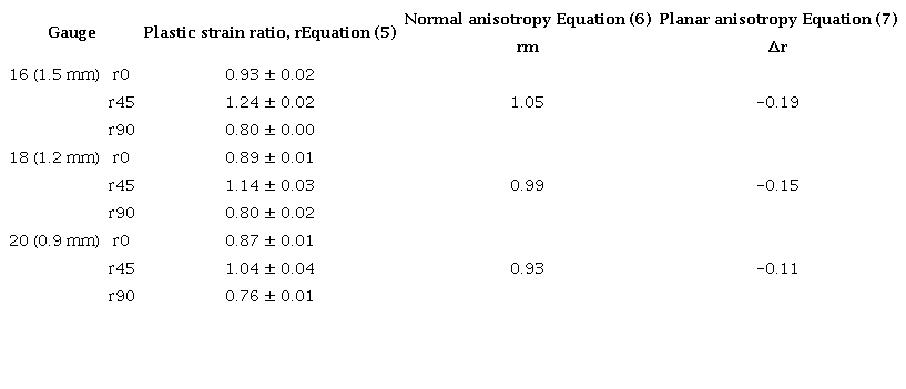 Values of the normal anisotropy, rm, determined by Equation (6): 1.05; 0.99, and 0.93 are slightly higher than the 0.906 obtained by Coello and others for an AISI 304 steel (drawing quality) of 0.8 mm thickness [19]. Similarly, they are less than the 2.44 reported by du Toit and Steyn for a 0.7 mm thickness AISI 304 steel [20], and similar to the r0= 1,01 r90= 0,91 written by V. Talyan for a steel AISI 304L 1,168mm thickness [21].