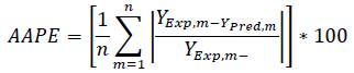 El desempeño del modelo de la red neuronal aplicada se evaluó calculando el error porcentual absoluto medio AAPE, ecuación (18) y el coeficiente de determinación 𝑅2, ecuación (19).