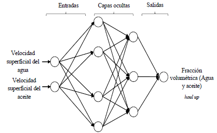Se aplico un modelo de red neural artificial que permite predecir las fracciones volumétricas (holdups) de un flujo bifásico (aceite-agua) en un tubo horizontal. Se utilizaron las velocidades superficiales de los fluidos como variables de entrada y las fracciones volumétricas como variables de salida. Se uso la técnica de válvulas de cierre rápido para tomar los datos de las fracciones volumétricas. El modelo desarrollado presentó una precisión en la predicción con un error porcentual absoluto promedio AAPE= 3.95 y un coeficiente de determinación de 𝑅2= 0.975. Este modelo de red neuronal implementado puede predecir la fracción volumétrica para el aceite y el agua, parámetros importantes del flujo bifásico y conectados directamente al comportamiento del flujo liquido-liquido dentro de las tuberías, lo que permitiría mejorar la eficiencia y seguridad de las operaciones de equipos e instalaciones industriales.