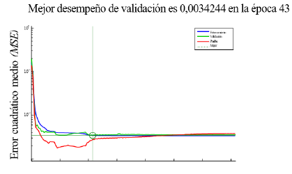 Los resultados obtenidos para la red neuronal artificial aplicada son presentados en la tabla 1, donde se muestra que el mejor entrenamiento se da para 10 neuronas en la capa oculta, la precisión para la predicción de la red neuronal se alcanza con un error porcentual absoluto medio AAPE= 3,95 y un coeficiente de determinación de 𝑅2= 0,975. Para el ciclo de corrección de propagación hacia atrás se considera las mejores ponderaciones y sesgos de entrada 43 épocas como se muestra en la figura 4.