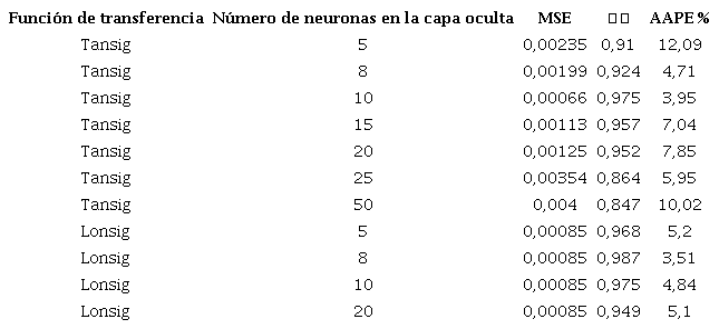 El procedimiento para la predicción del rendimiento de la red consistió en variar el número de neuronas, esto para evitar una posible selección errada de los pesos iniciales.