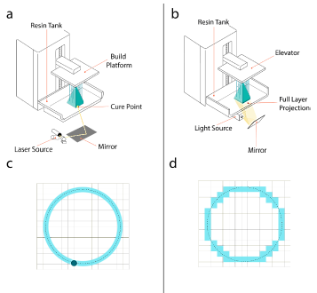 SLA uses a laser to cure selectively the resin through the action of scanning mirrors, sometimes lenses are used to help focus the laser light. This process can achieve a final print resolution of 20 |im [11], this resolution is related to the laser beam size. A common set up of SLA technology is depicted in Figure 1. On the other hand, DLP relies on a digital micro-mirror device used in order to project different light geometries of the part cross section, to polymerize a complete layer of resin, making this process faster (but sacrificing resolution), as the minimal measure of the final printed part is limited by the pixel size of the projector screen. A common set up of DLP technology is shown in Figure 1. As a result of the differences in the operating conditions and apparatus set up, SLA technology offers a more accurate impression, although it takes longer than DLP, as DLP can print complete layers at a time considerably shorter. The pixelated effect on the DLP technology is due to the light being projected from a light projector, the pixel size determines the accuracy of each printing. Such pixel size is usually referred to as a 'voxel' in 3D printing [12], which is considered short for 'Volumetric picture element' or 'volumetric pixel'.