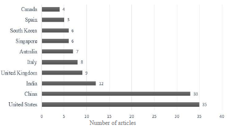 The Scopus report (Figure 2) shows the number of articles by country (the 10 most relevant countries) in the study of the 137 initial results of the search string 1, with the United States and China taking participation in over 30 documents each, followed by India and the United Kingdom with nearly half the participation from that of the United States and China individually.