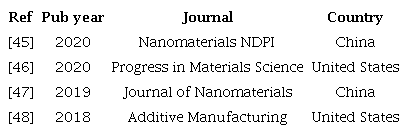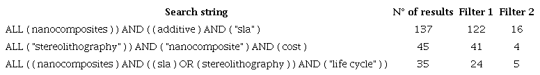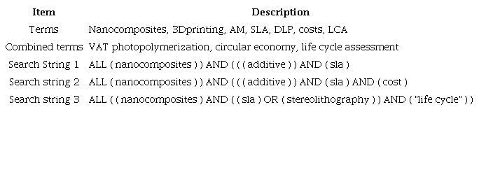 As the aim of this study is to analyze those articles relating nanocomposite materials and the VP technologies, an initial search in the database was performed involving the 'nanocomposite' and 'additive' topics. Searches were narrowed by excluding publications before 2015 which were surprisingly very few [28], [29], [30], [31]. Also, books and book chapters, as well as conference papers, were excluded from the search as this review will only analyze research articles. The search was conducted using the search strings and keywords listed in Table 1.