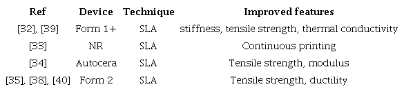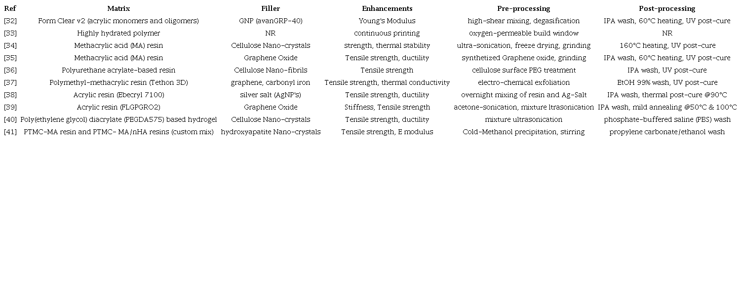 The use of heat post curing processes in ovens, instead of direct UV light post curing in most of the analyzed articles, shows a trend on the combination of post processes to ensure the proper achievement of desired mechanical, thermal and electrical properties of the nanocomposite materials. One of the studies [45] allegedly used a SLA apparatus that was not possible to find information of, presumably either an own-built device or the model name. A web search was performed trying to find information about it and the results showed that such a device has only been used in S. Mubarak et al. [45] work, and their study was the only one from the selected articles in this review to use TiO2 nanoparticles (TNPs) as reinforcement. Also, Zuo et al. [37] did not report the device used in their study; however, they did report the software used to create the CAD models to be printed, which was reported to be 'Autodesk 3D max'. Autodesk company has a single 3D VP printer, which is known under the name of 'EMBER 3D desktop printer' that the company stopped producing due to reasons that are not a concern of this review.