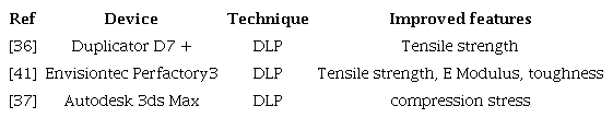 The digital light processing 3D printing technique (usually referred to as DLP) consists of the curing of an entire layer of the part to be printed. This is usually achieved by using either a UV display or a UV light projector, which projects the geometry of a complete layer at the same time, thus achieving faster printing but reducing the resolution of the print, as such resolution is now the pixel size of the screen or projector. Figure 1 shows a schematic set up of a DLP device. Table 5 shows the studies in which a DLP apparatus was used, along with the kind of printer used and the main improved feature with the addition of the Nano reinforcement.