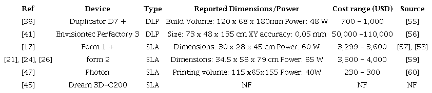 Table 8 shows a list of the printing devices used in the documents from search string 1, 2 and 3 with the corresponding used VP technique, device purchase cost range, and their main features of dimensions and power.