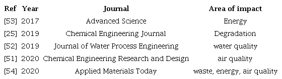 On this third stage of the study, articles that are related to VP technologies, nanocomposites and Life cycle assessment were of interest. 35 articles were initially scouted by the Scopus database, after their subsequent filtering and analysis of abstract, title, and keywords. Only 5 articles out of the initial 35 documents mentioned the compound term of 'life cycle assessment' or LCA. LCA is a technique used to evaluate the potential environmental impact of a product life cycle starting from the raw materials involved in its fabrication, to the final product and disposal [50].