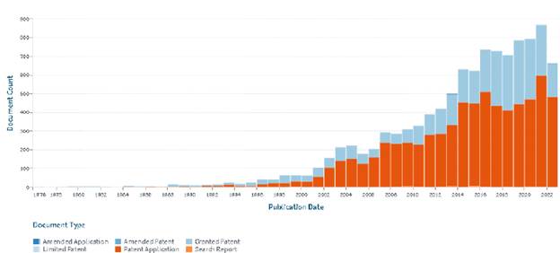 La revisión bibliométrica se basó en artículos científicos, empleando los siguientes motores de búsqueda: Lens org, Google Scholar, Scopus, Scielo y Library Génesis, con las siguientes palabras claves: "PET pyrolysis" y "PS pyrolysis". La revisión inicia con el motor de búsqueda Lens org, con el fin de hacer un barrido internacional, utilizando las palabras claves ya mencionadas, para las obras académicas, sin filtros temporales y de esta manera registrar la evolución a través del tiempo. Aquí se observa un incremento en la producción científica relacionada a patentes, con una alta tasa de aumento (ver figura 2).
