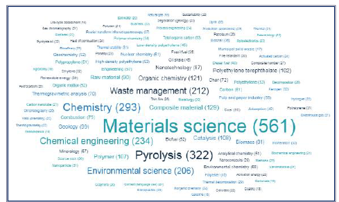 Se obtuvo los siguientes campos de estudio referentes a esta palabra clave, donde predomina "ciencia de los materiales" con 531 publicaciones, "pirólisis" con 322 y "PET" o "tereftalato de polietileno" con 102 resultados (ver figura 3).