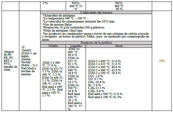 Dadas las características expuestas en la tabla 4, se observa que, en el proceso de pirólisis, se prefiere el uso de los catalizadores heterogéneos a 250 °C, por su economía, la reutilización del mismo, y la facilidad de la separación del producto líquido y el catalizador en fase sólida en la fase final [38].