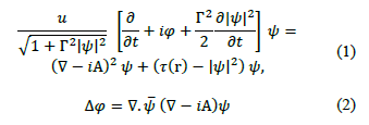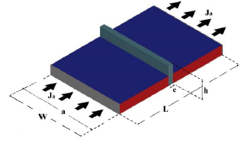Hemos considerado una película superconductora de ancho 𝑊 = 8𝜉, largo 𝐿 = 12 𝜉, con un pilar central rectangular de base ?? = 1𝜉 y altura 𝜏. En el limite de película delgada tenemos que su grosor d es d << 𝜉, y su ancho es de tamaño intermedio, 𝜉 << W << 𝜆, donde 𝜉 es la longitud de coherencia y 𝜆 es la longitud de penetración de London. La muestra está en presencia de una corriente continua Ja que se aplica uniformemente a través de los electrodos metálicos de ancho a = W (vea figura 1). La forma general de las ecuaciones Ginzburg-Landau dependientes del tiempo para sistemas en presencia de corrientes para el parámetro de orden 𝜓 y el potencial vectorial A, en su forma adimensional es [11], [12], [21], [22]: