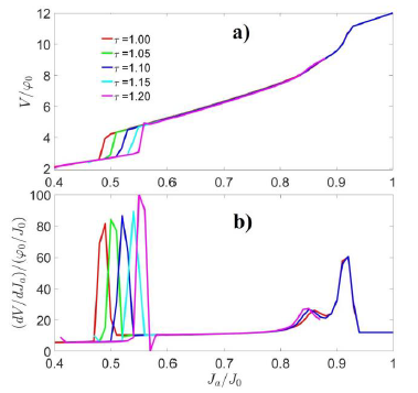 Analizamos las curvas voltaje-corriente I-V y resistencia-corriente I-R modificando en cada caso la altura del pilar mediante el parámetro 𝜏. Las figuras 2(a, b) muestra el voltaje promedio en el tiempo V y la resistividad 𝜕V/ 𝜕𝐽𝑎 en función de la corriente aplicada 𝐽𝑎, para 𝜏 = 1; 00; 1; 05; 1; 10; 1; 15; 1; 20, respectivamente. Como se puede ver en esta figura, los saltos en la corriente indican los valores en los cuales los pares de vortices-antivórtices V-αV penetran en la muestra J1 es J1 = 0;48;0;50;0;52;0;54;0;56 para 𝜏 =1;0;1;05;1;10;1;15;1;20 respectivamente. Nótese que J1 aumenta cuando 𝜏 aumenta. Para corrientes mayores Jα> J1 el sistema entra en un estado resistivo con un salto finito en el voltaje de salida, señalado por una discontinuidad en la resistencia 𝜕V/ 𝜕𝐽𝑎 en función de la corriente aplicada Ja. Es necesario indicar que, aunque se observan valores de resistividad para Jα< J1 estos son causados por los conectores que inyectan la corriente en la muestra. En el intervalo J1< Jα< J2, donde J2 indica la segunda corriente crítica, en la cual ingresa un segundo par V-αV o pasa al estado normal, la muestra está sometida a la presencia de los pares v-aV en dos situaciones de aniquilación, diferenciadas por la posición de creación y destrucción de los pares además de su trayectoria sobre la muestra.