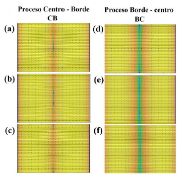 En la figura 3(a-c) graficamos el parámetro de orden en escala logarítmica en el caso homogéneo t = 1 para un intervalo de tiempo determinado. Primero, los pares V-αV se generan en el centro de la muestra y se expulsan a través de los bordes. A esta situación de aniquilación la llamamos proceso aniquilación centro-borde CB. A un cierto valor de Jα, hay una inversión de este proceso, ahora los pares V- αV se forman en los bordes y luego se aniquilan en el centro de la muestra (figura 3(d-f)), llamado ahora proceso aniquilación borde-centro BC. Las dos situaciones de aniquilación están delimitadas por el máximo local de la curva I-R (figura 2(b)). Este comportamiento solo se observa en el caso de una muestra homogénea. Las supercorrientes, como se puede apreciar son paralelas a la corriente aplicada en toda la muestra.