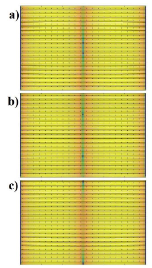 Podríamos intuir físicamente que haciendo más fina la malla computacional apreciaríamos que cuando se ha generado el par en el centro de la muestra, las líneas que representan la densidad de corriente que están más hacia los bordes superior e inferior, se aprecian completamente horizontales y las líneas que se encuentran cerca del centro de la muestra se verían curvadas por la cercanía con el par V-αV. Este mismo comportamiento generaría patrones de diferente densidad de corriente a medida que los vórtices van cambiando su lugar hacia los bordes de la muestra, en [26] se consideran los efectos de la geometría de defectos sobre la respuesta resistiva de películas superconductoras en presencia de corrientes, en este trabajo se relaciona que, para un defecto cuadrado no centrado, el par V-αV nuclea de forma no simétrica en la muestra debido a la asimetría de la supercorriente en la muestra y que un defecto triangular quiebra la simetría espacial para el movimiento de los pares V-αV.