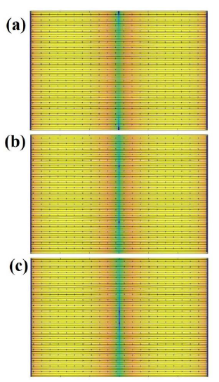 En la figura 4(a-c), se muestra el estado resistivo para la muestra superconductora con un pilar de altura t = 1;05. Podemos observar que, en este caso el par VαV se crea en el centro de la muestra y se mueve hacia los bordes, donde son expulsados en un proceso CB. Considerando otras corrientes y tiempos se pude observar igualmente la aparición de procesos BC. Podemos observar que las flechas negras que apuntan uniformemente en el mismo sentido que la corriente aplicada que representan la densidad de supercorriente sobre la muestra, presentan un patrón que es independiente de la ubicación del par V-αV y de la altura del pilar.