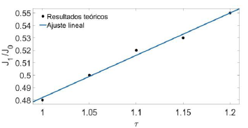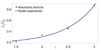 En la figura 8 se muestra la relación entre J1 (corriente en la cual el primer par de pares vórtices-antivórtices ingresan en la muestra) y 𝛾. Aquí encontramos una dependencia exponencial de la forma J1 =0;17+ 0;004exp (𝛾 /0;58) (línea azul en la figura), lo cual nos permite predecir las corrientes críticas para diferentes condiciones de contorno, así el rápido crecimiento de J1 implica que cuanto mayor sea la Tc del material en contacto, más diamagnética será la muestra de estudio, lo cual resulta favorable experimentalmente, ya que la aparición de un estado resistivo ocurre para mayores J1 a medida que aumenta y. Entonces, el retraso en la primera penetración de los vórtices cinemáticos podría mejorarse fuertemente al rodear el pilar con una capa delgada de otro material superconductor de mayor Tc.