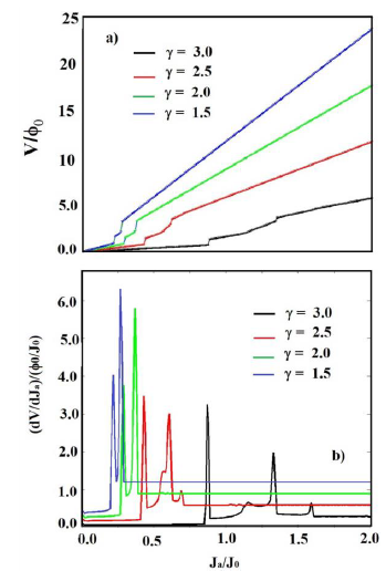 En la figura 7(a,b) se muestran las curvas de Voltaje V promediado en el tiempo en función de la densidad de corriente aplicada Ja y resistividad 𝜕V/ 𝜕𝐽𝑎 en función de la corriente aplicada Ja para 𝜏 = 1;1 respectivamente. 𝛾 = 1;5;2;0;2;5;3;0 sobre la parte lateral externa del pilar (paralela a la corriente), para el resto de la muestra se toma 𝛾 = 1;0. Como podemos apreciar en la figura 7(a), J1=0;21;0;33;0;45;0;87 para 𝛾=1;5;2;0;2;5;3;0 respectivamente. Observamos que J1 aumenta con 𝛾.