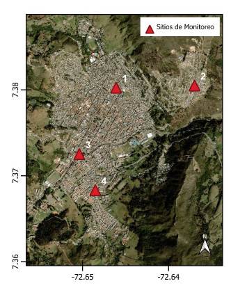 Los sensores fueron ubicados estratégicamente en la ciudad de Pamplona (Figura 3), siguiendo las recomendaciones de la Agencia de Protección Ambiental de los Estados Unidos (USEPA) para la instalación de redes de monitoreo de calidad del aire [16], así como, las correspondientes al protocolo para el monitoreo y seguimiento de la calidad del aire del Sistema de Vigilancia de la Calidad del Aire (SVCA) de Colombia [17].