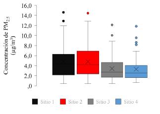 Observando que el sitio de monitoreo 1 y 2 presentan las medias y los valores atípicos más elevados, entre los cuatro sitios de monitoreo. Estos dos sitios se encuentran al norte de la ciudad, donde se ubican varios colegios y universidades, lo cual puede ocasionar que se desarrollen mayores actividades de comercio. El sitio de monitoreo 2 se encuentra cerca de una vía principal, muy concurrida por visitantes y el transporte de productos agrícolas [18].