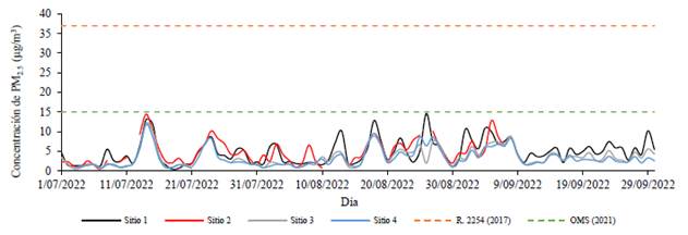 El gráfico de serie de tiempo (Figura 5) para los cuatro sitios de monitoreo muestra el comportamiento de las PM2.5 en el tiempo, para comparar las concentraciones de PM2.5 registrada por los sensores con los límites máximos permisibles de exposición en 24 horas de 37 y 15 μg/m3, establecidos por la Resolución Colombiana 2254 en 2017 [21] y de la OMS del año 2021 [22], respectivamente.