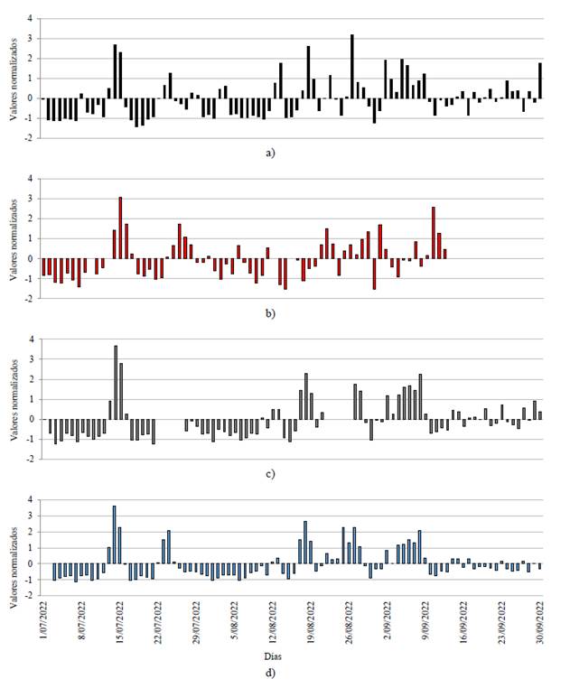 El comportamiento de la concentración de las PM2.5 registradas en los cuatro sitios pareciera ser similar a lo largo del tiempo, no obstante, a través de los gráficos de tipificación (Figura 6) se logró observar que para el sitio 1 y 2 su distribución normal con respecto al promedio diario varía en su mayoría para los días analizados.