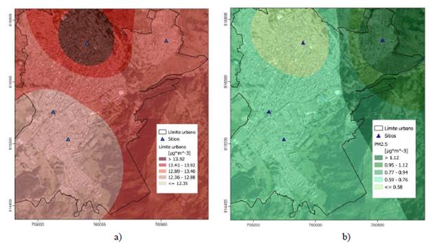 La información una vez validada, se utilizó para crear mapas de distribución por PM2.5 en la ciudad de Pamplona. Se utilizó la Ecuación 2 y 3 de interpolación, usando el asistente de técnica Inversa de la Distancia Ponderada (IDW, por sus siglas en inglés), a través de QGIS en su versión 3.24.1 [20]. Los mapas de distribución se realizaron para las concentraciones mínimas y máximas registradas de PM2.5.