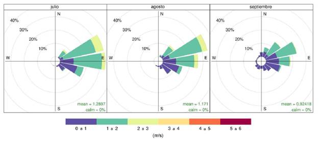La dirección y velocidad del viento son importantes para estudios en calidad del aire [24]. En la Figura 8, se muestran las rosas de viento para el periodo monitoreado, observando para julio vientos provenientes mayormente del componente este (E) y este-noreste (ENE) con una frecuencia del 35 y 32 % en julio; 25 y 32 % en agosto; 18 y 22 % en septiembre, respectivamente.