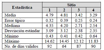 En la Tabla 1, se observa que las concentraciones promedio diario estuvieron en el rango de 3-5 µg/m3 para todos los sitios, teniendo las máximas concentraciones horarias registradas de 14.62 y 14. 44 µg/m3 en el sitio 1 y sitio 2, respectivamente. Asimismo, se observaron las concentraciones horarias más bajas de 0.41 y 0.42 µg/m3 para el sitio 2 y 3 siguiendo el mismo orden. Por otro lado, el sitio 1 tuvo la mejor cobertura en cuanto a los días validados con un 100 %, seguido del sitio 4 con un 98 %, no obstante, el sitio 2 tuvo la una deficiencia de días validados con un 70 %, atribuyendo esta deficiencia a las fallas registradas en bitácora debido al suministro de energía.