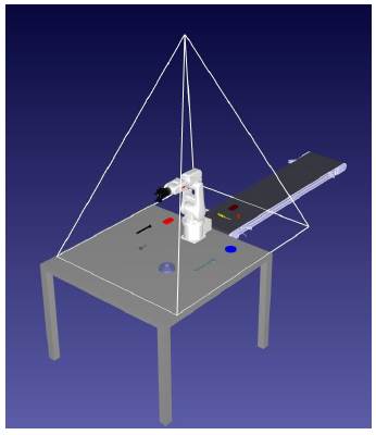 Considerando el área de interés, se propone un ambiente simulado en el software Robodk [18], basado en un sistema automatizado de una planta de producción. Este se enfoca en realizar un estudio en un escenario del mundo real, donde la información de referenciamiento espacial es captada por una cámara afín cuya matriz de calibración es la ecuación (1), con los parámetros de la Tabla 3. La información extraída a través de la cámara determinará el espacio de configuración que debe tener en cuenta la ubicación de los recipientes y herramientas comentados en la Tabla 1, el robot manipulador ABB IRB 120-3/0.6 [16], la mesa de trabajo y la banda transportadora.