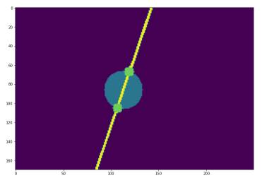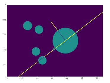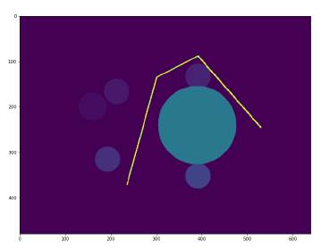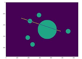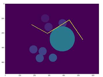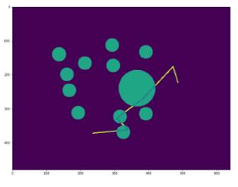 , desde el punto inicial (Pi) al punto final (Pf), Figura 10 y otra con la ubicación de los obstáculos y sus radios de seguridad (M0). Tanto la línea como los obstáculos tienen intensidades distintas y al comparar las máscaras (𝑀0𝑙=𝑀0−𝑀𝑙), se crea una diferencia de intensidad en los puntos que comparten la línea de principio a fin (