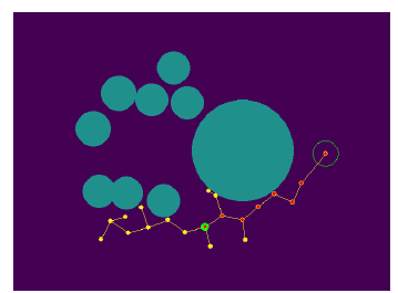 Para comprender el algoritmo 1 (EPBG) (Tabla 2), se deben definir todos los parámetros y variables que interactúan dentro de él. Primero, el algoritmo recibe como entrada el punto inicial (Pi), el objetivo final a alcanzar (Pf) y su salida deberá ser una ruta que conecte dichos puntos sin chocar con ningún obstáculo (Ruta). Segundo, la variable de escala de radio de seguridad (EscalaRS), que se declara inicialmente como 1, se refiere a un espacio de seguridad que se le da a cada obstáculo. Al incluir esta variable se busca que no existan choques con la herramienta del manipulador y los obstáculos. Esta variable multiplica el valor que se le da como radio de seguridad a cada obstáculo, y al aumentar su valor modificará la selección de los puntos para la ruta, de modo como se muestra en la Figura 9.