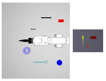 El objetivo de este montaje es validar el algoritmo en un ejercicio de ordenamiento de objetos. Este debe establecer las rutas necesarias para recoger herramientas y recipientes de la mesa de trabajo y llevarlos a la cinta transportadora. Se evalúa el comportamiento del algoritmo cambiando la pieza a organizar.