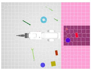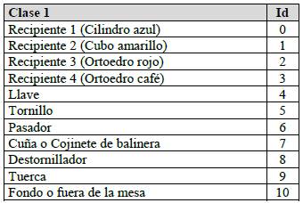 Las imágenes tomadas por la cámara, para poder ser interpretadas, necesitan pasar por un proceso de segmentación, para esto se utilizó una herramienta de anotación llamada Js segment annotator basada en SLIC super pixels Figura 3, haciendo una segmentación interactiva coarse-to-fine, ajustando la resolución de los superpixels a lo necesario para marcar segmentos pequeños y aplicando suavizados con morfologías para remover artefactos [17]. La salida de este anotador son unas mascaras con etiquetas, para este ejercicio se crearon 11 clases las cuales se definen entre herramientas, recipientes y fondo, como se muestra en la Tabla 1 y la Figura 4.