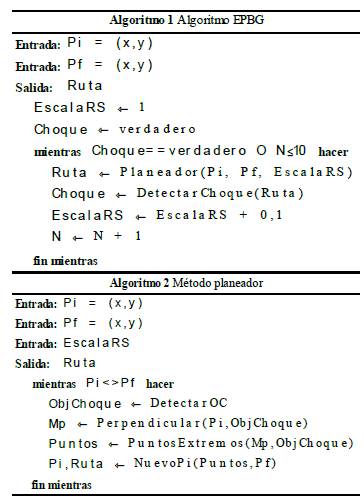 Una vez aclaradas las variables, entradas y salidas, se puede hablar de la función principal Ruta ⇽ Planeador (Pi, Pf, EscalaRS), que se muestra en el algoritmo 2 (Tabla 2). Dentro de esta función se encuentran los procesos fundamentales para la generación de una ruta.