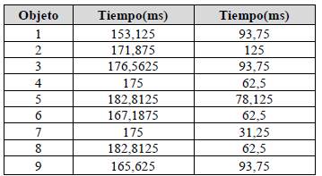 En términos de tiempo de procesamiento, se seleccionó un algoritmo con la misma complejidad computacional como lo es RRT. Realizando la comparación, tomando los tiempos que tarda cada algoritmo para encontrar una ruta desde un punto inicial a un punto final para cada objeto, evadiendo obstáculos y tomando primero los objetos más cercanos al punto final. Se tomó una muestra de 10 pruebas para cada objeto y se sacó un promedio con los valores de tiempo ejecutado, tanto para RRT como para EPBG, como se observa en la Tabla 5 y la Figura 18. Esto teniendo en cuenta que el algoritmo RRT crea sus rutas mediante un muestreo aleatorio [12]. Al final se evidenció que para todos los objetos el algoritmo EPBG presenta mejor rendimiento, presentando mejoras entre 38% y 48%.