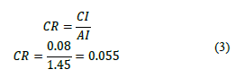 Después de calcular el valor máximo, se procede a realizar el cálculo del índice de consistencia (CI), en este, se resta el número de columnas de la matriz al valor máximo obtenido con la Ecuación 1, el resultado obtenido de esto, se divide por el número de columnas menos 1. Mediante la aplicación de la Ecuación 2 obtenemos el índice de consistencia, el cual presenta un valor equivalente a 0.08.