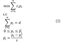 Economic dispatch is one of the classic problems in power system operation. This problem consists of minimizing system operation costs subject to load balance constraints, generation capacity, and primary resource dynamics as shown in (2).