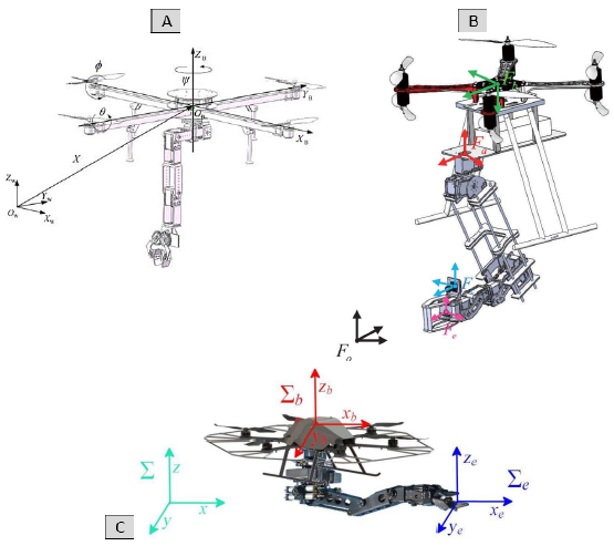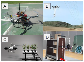 Different works in recent years have addressed these topics; adaptive control and inverse kinematics for trajectory tracking [17]; perception system to estimate occluded objects for aerial manipulators [18] (see Fig.4 -A); force control for cooperative task between aerial manipulators [19]; Cartesian impedance control to build a dynamic relationship between UAV and its robotic arm [20]; disturbances and torque generated by the robotic arm of an aerial manipulator are taking into account to control the system attitude [21]; robust control to stabilize an aerial manipulator while its robotic arm is interacting with the environment [22]; hybrid force/velocity control for vertical surface contact [23]; estimate torques and moments exerted by the robotic arm of the aerial manipulator through a Kalman Filter or a Luenberger observer [24]; adaptive and sliding mode control to estimate external and internal disturbances to regulate attitude and position in the system [25]; integration of Image-Based Visual Servoing (IBVS) and Position-Based Visual Servoing (PBVS) into a controller for aerial manipulators [26]. Some models of the previously referred works are shown in Fig.3.