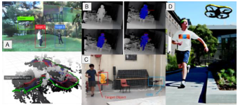 [39] Chasing a moving target that changes randomly its path is a complex task; moreover, when there are multiple obstacles, to address this problem [40] propose a path planner for micro aerial vehicles (MAV) based on convex optimization in simulated environments. The same problem can become more complicated when there is more than one target, [41] present a prediction method to chase two moving targets into the same frame; the UAV is equipped with a stereo camera and an inertial measurement unit (IMU); furthermore, the obstacles avoidance and the occlusion problem are considered (see Fig.5 -A).